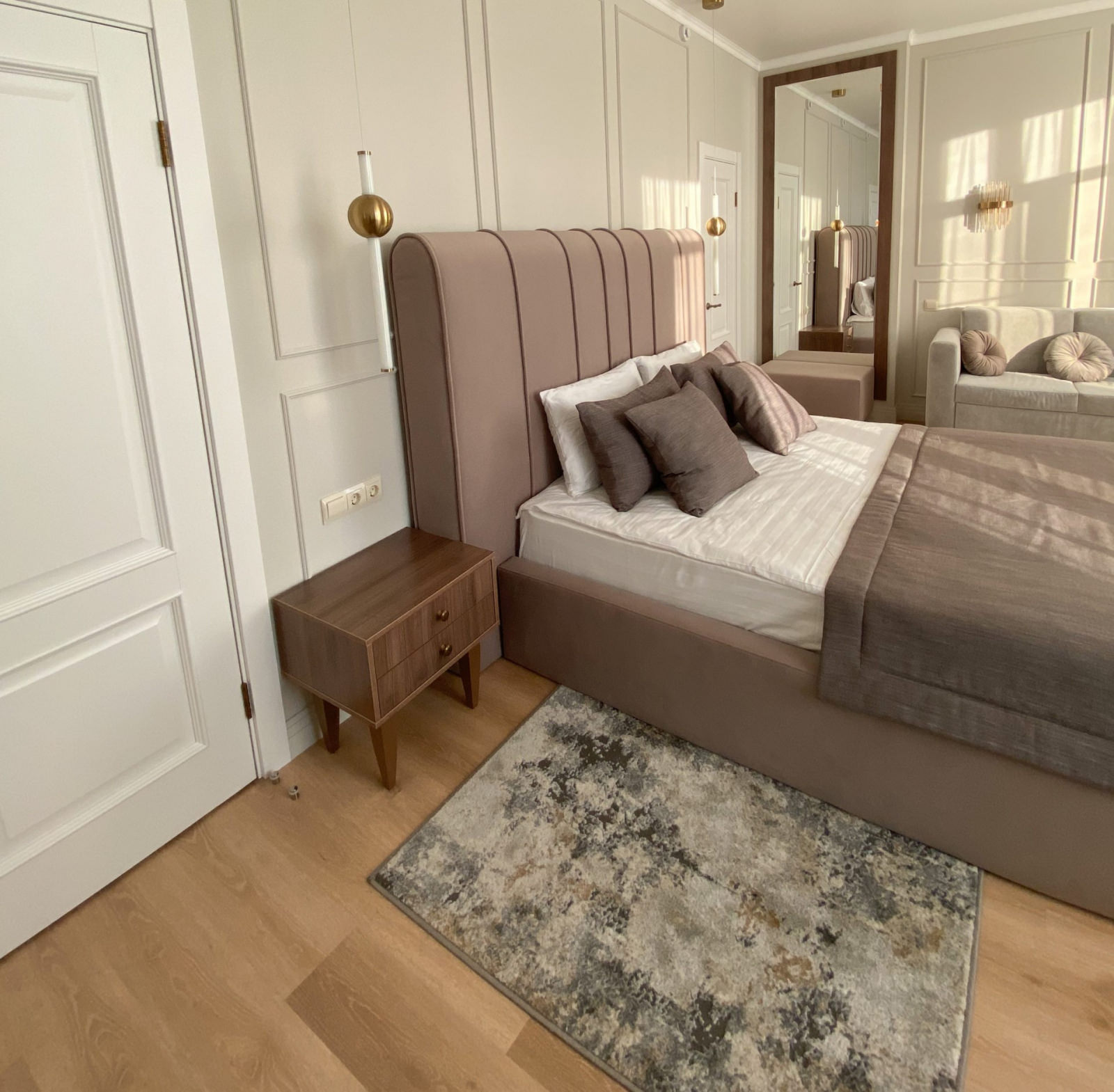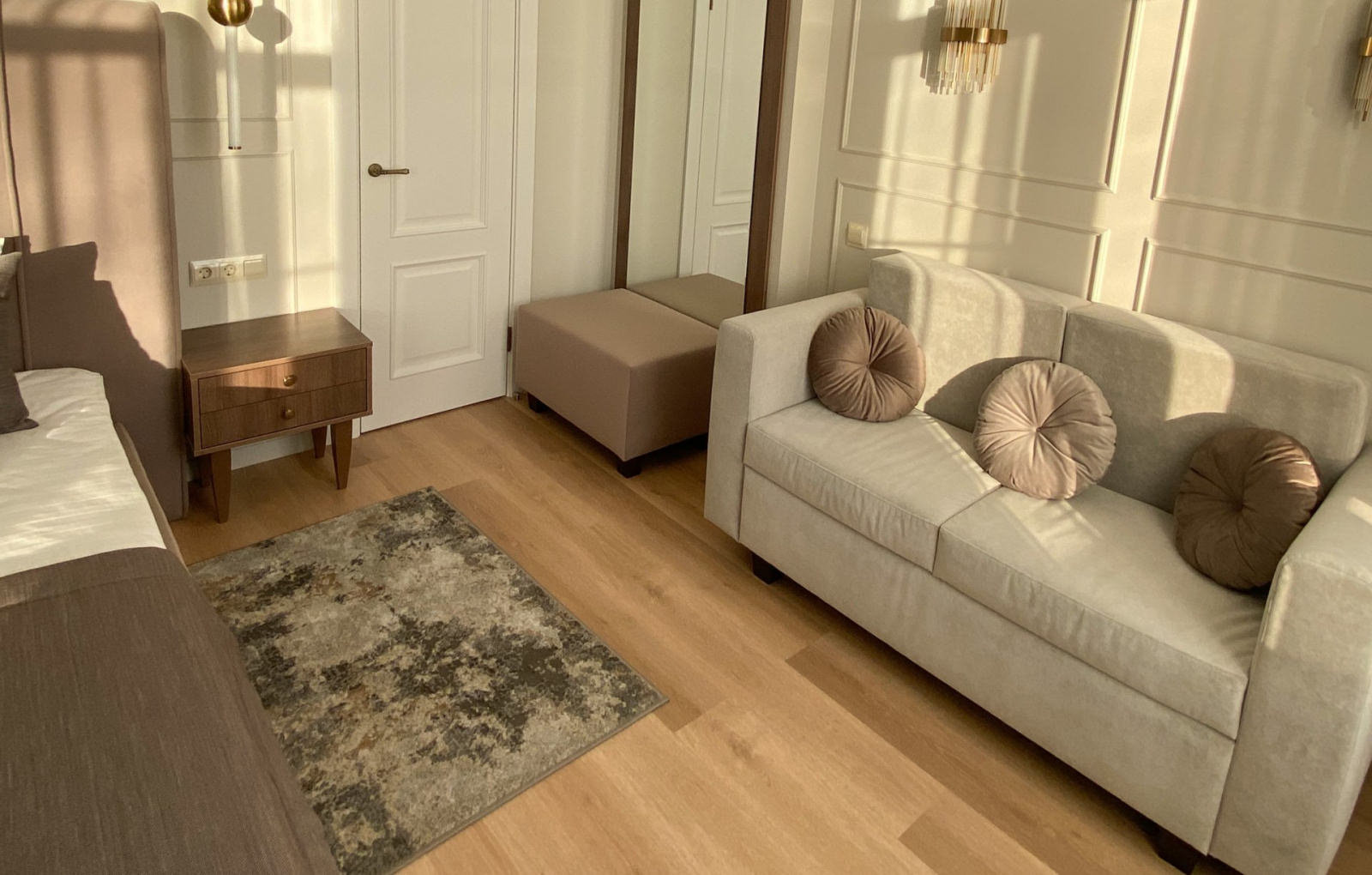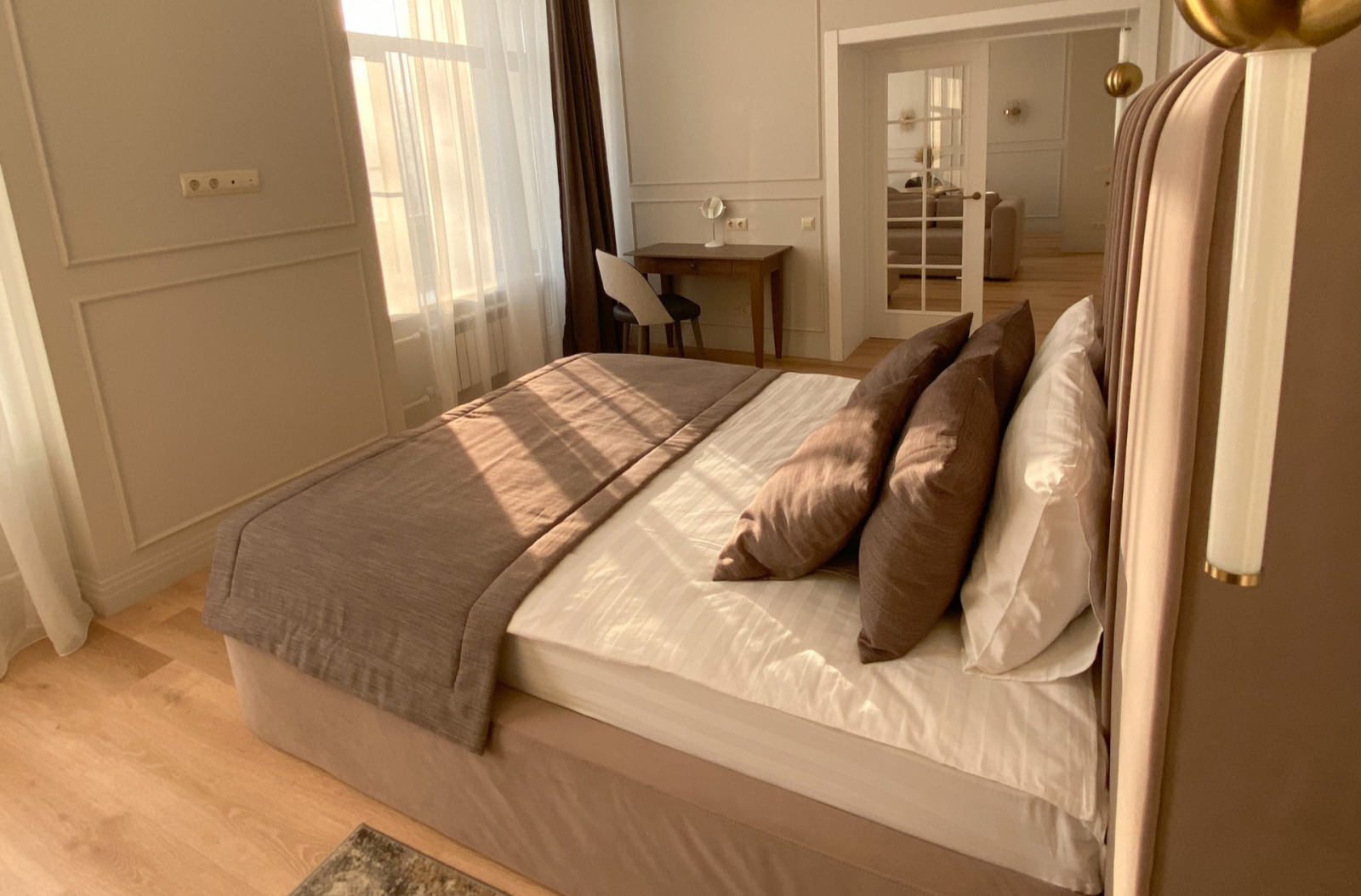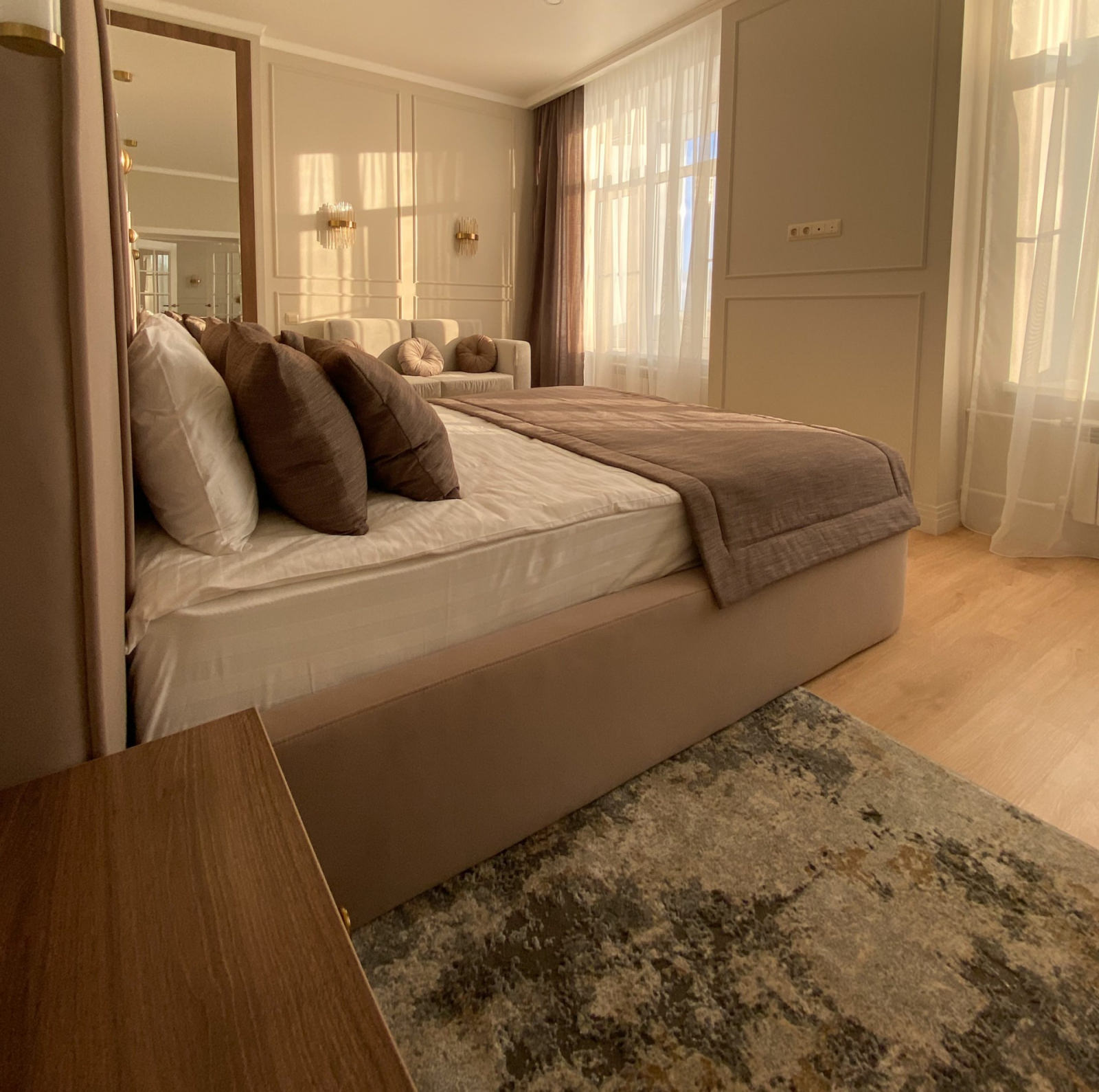 2 осн. места. 3 доп. места. Балкон. Кухня. Мебель: диван раскладной, кровать двуспальная, кухонная мебель, прикроватная тумбочка, стол, стулья, шкаф. Оборудование: вентилятор, микроволновая печь, набор посуды, телевизор, телефон, утюг, холодильник, электрочайник. Санузел: с ванной, туалетные принадлежности, фен, халат. Сервис: Wi-Fi бесплатно, смена полотенец, смена постельного белья, уборка номера, услуги телефонной связи по территории отеля.