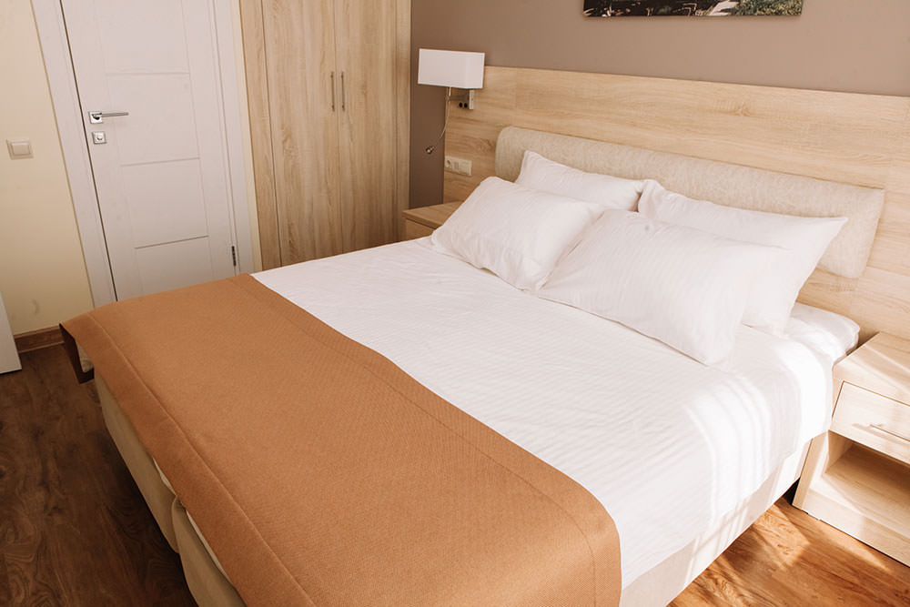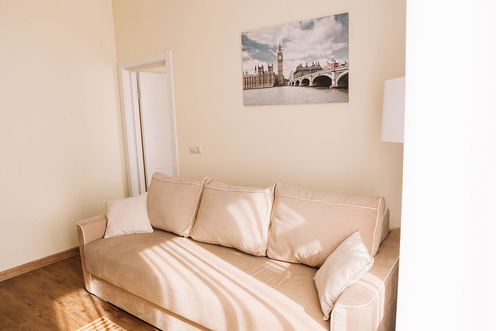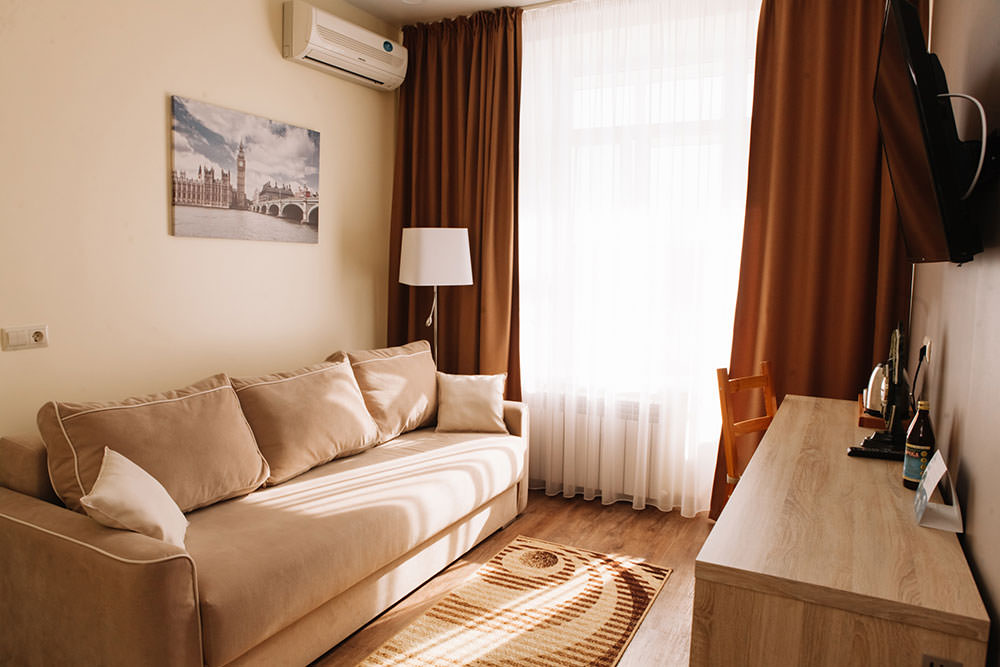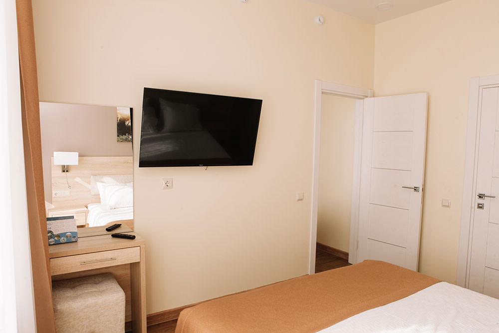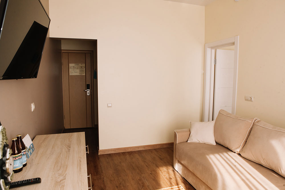 2 осн. места. 2 доп. места. Мебель: вешалка, диван, зеркало, кровать двуспальная, прикроватные тумбочки, стол, стулья, шкаф. Оборудование: кондиционер, набор посуды, сейф, телевизор, телефон, утюг, холодильник, чайный набор посуды, электрочайник. Санузел: с ванной, туалетные принадлежности, фен. Сервис: Wi-Fi платно, смена полотенец, смена постельного белья, уборка номера, услуги внутренней телефонной связи.