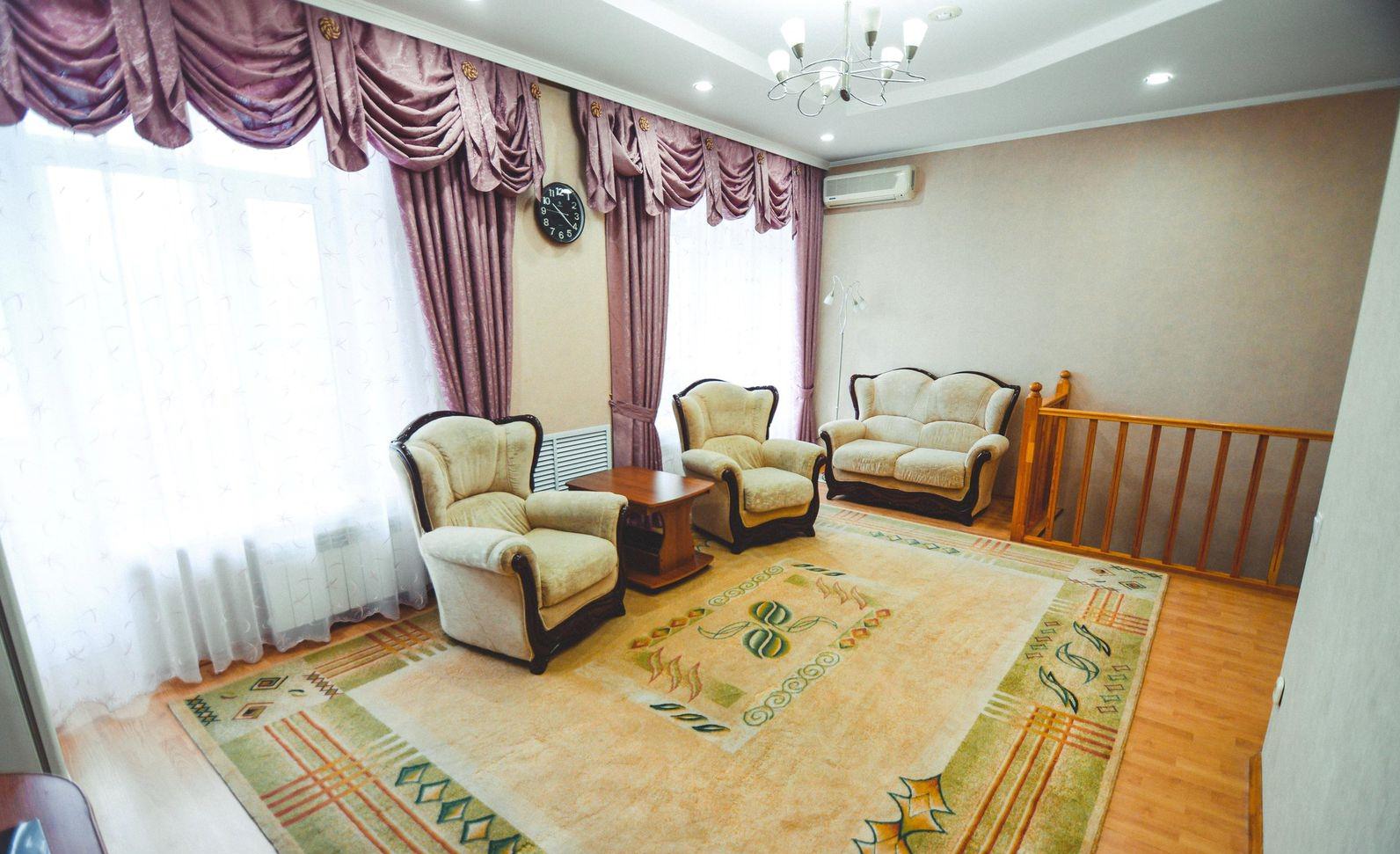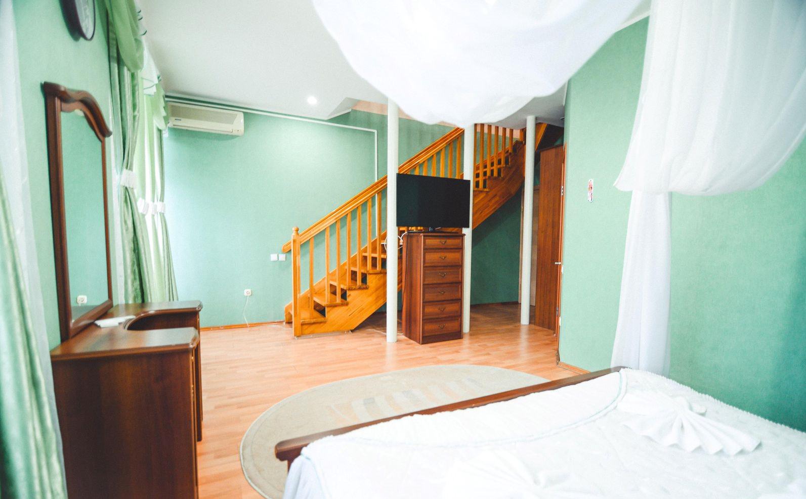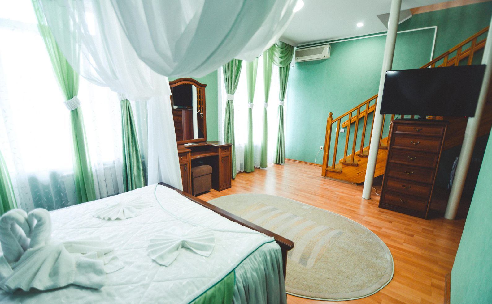 Площадь номера - 56 кв.м. 2 осн. места. 2 доп. места. Балкон. Мебель: вешалка, диван, зеркало, кресло (2), кровать двуспальная, прикроватные тумбочки, столик журнальный, шкаф. Оборудование: кондиционер (на каждом этаже), музыкальный центр, набор посуды, сейф, телевизор (на каждом этаже), телефон (на каждом этаже), утюг, холодильник, электрочайник. Санузел: с ванной и душевой кабиной, тапочки, туалетные принадлежности, фен, халат. Сервис: Wi-Fi бесплатно, смена полотенец, смена постельного белья, уборка номера, услуги внутренней телефонной связи.