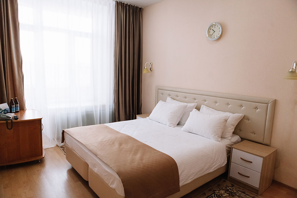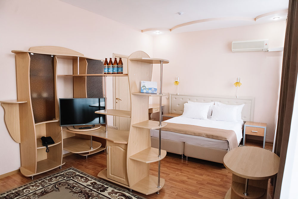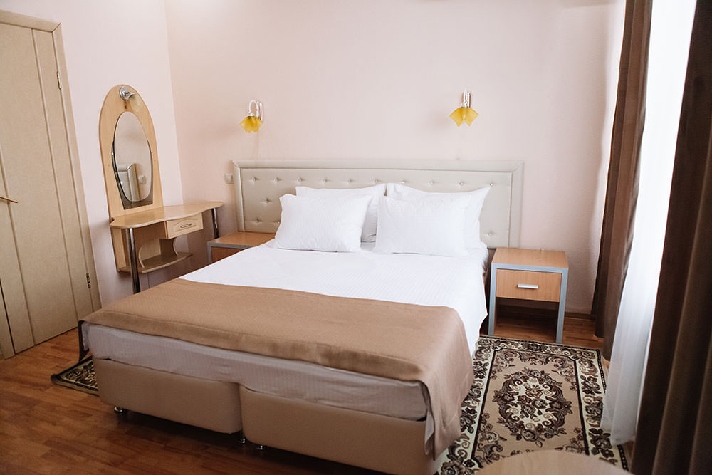 4 осн. места. 2 доп. места. Балкон. Мебель: вешалка, диван, зеркало, кресло, кровать двуспальная, прикроватные тумбочки, стол, стулья, шкаф. Оборудование: кондиционер, набор посуды, сейф, телевизор, телефон, утюг, холодильник, электрочайник. Санузел: с ванной, тапочки, туалетные принадлежности, фен, халат. Сервис: Wi-Fi бесплатно, смена полотенец, смена постельного белья, уборка номера, услуги внутренней телефонной связи.