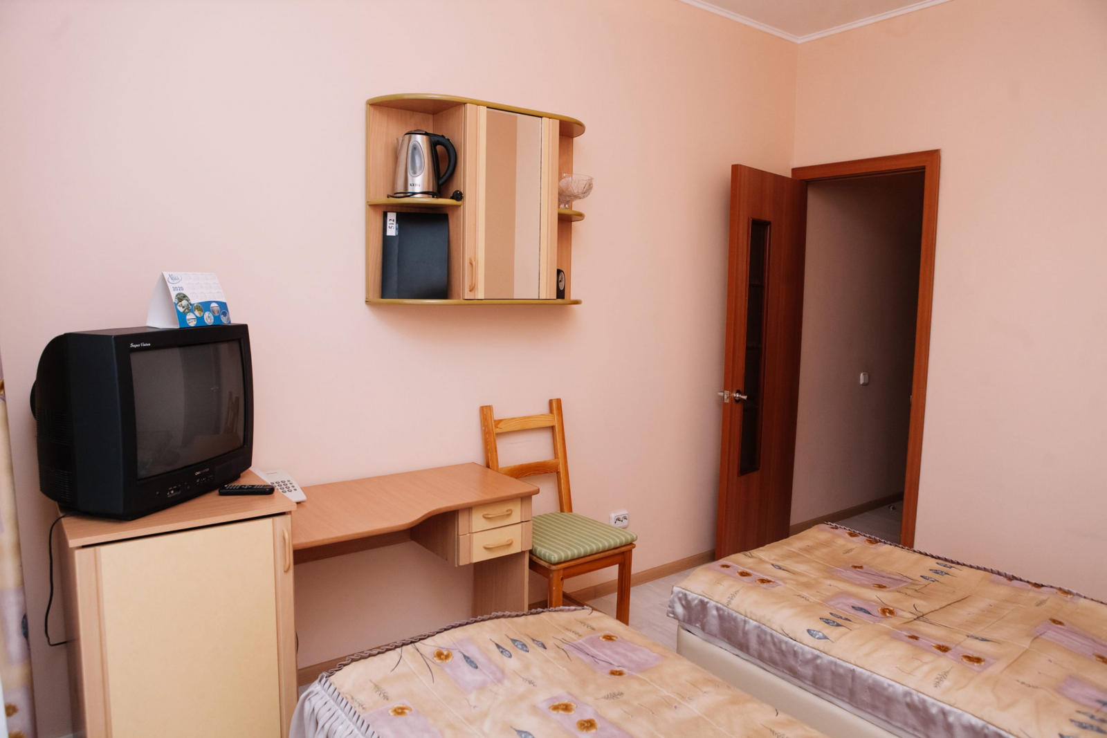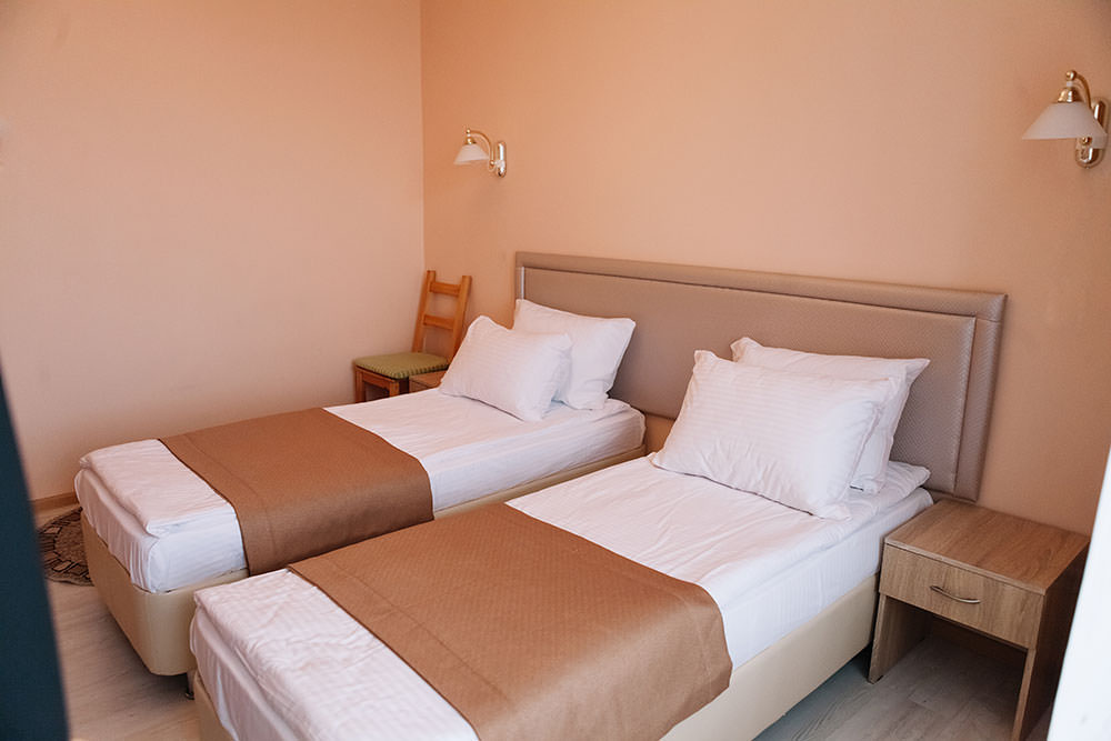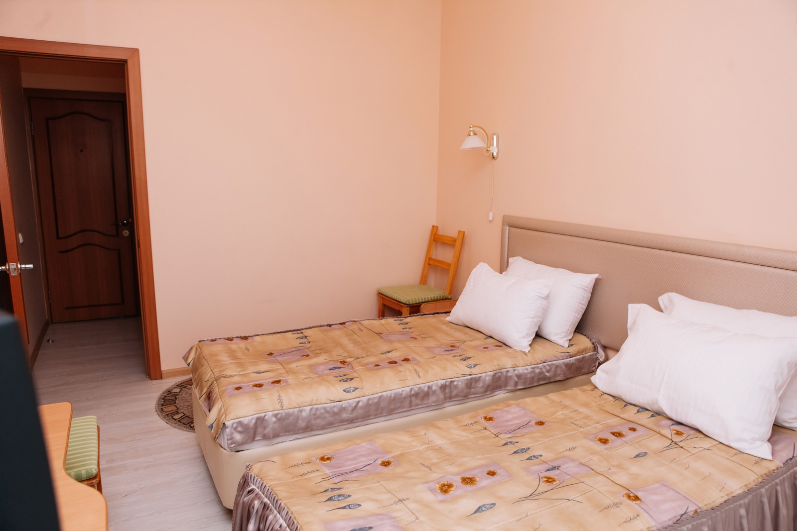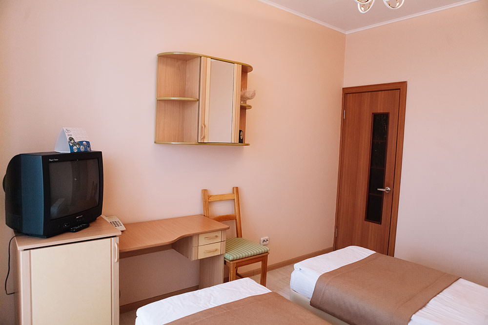 2 осн. места. 1 доп. место. Балкон. Мебель: вешалка, зеркало, кровати односпальные, прикроватные тумбочки, стол, стулья, шкаф. Оборудование: вентилятор, набор посуды, телевизор, телефон, холодильник, электрочайник. Санузел: с ванной, туалетные принадлежности, фен. Сервис: Wi-Fi бесплатно, смена полотенец, смена постельного белья, уборка номера, услуги телефонной связи по территории отеля.
